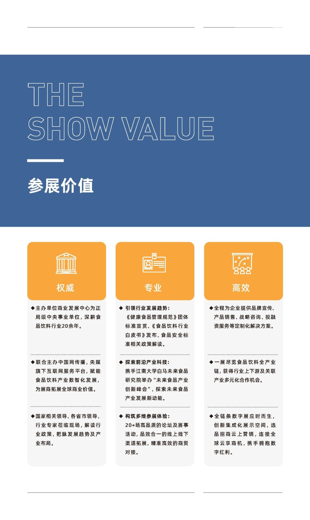包括植物基及新蛋白食品、未来食品、功能性食品及饮品、营养健康食品及补充剂、特医食品及儿童食品,打造专业高品质的“大健康”产业贸易平台。